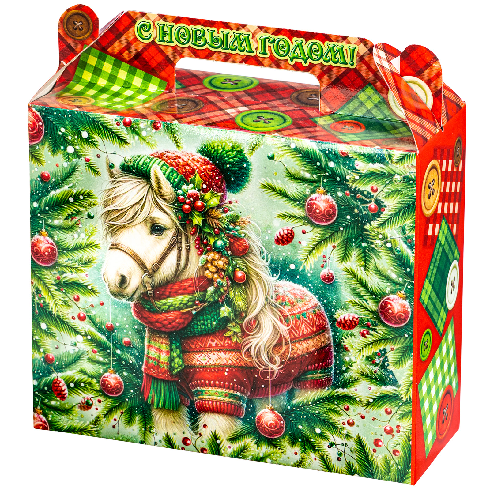 Интересный вариант новогоднего подарка – «Пуговка». Он представлен в разделе Картон. Отлично подойдет на подарок в 2026 году с символом Лошадь. Внутри такого презента находится кондитерский набор весом 500 граммов.
