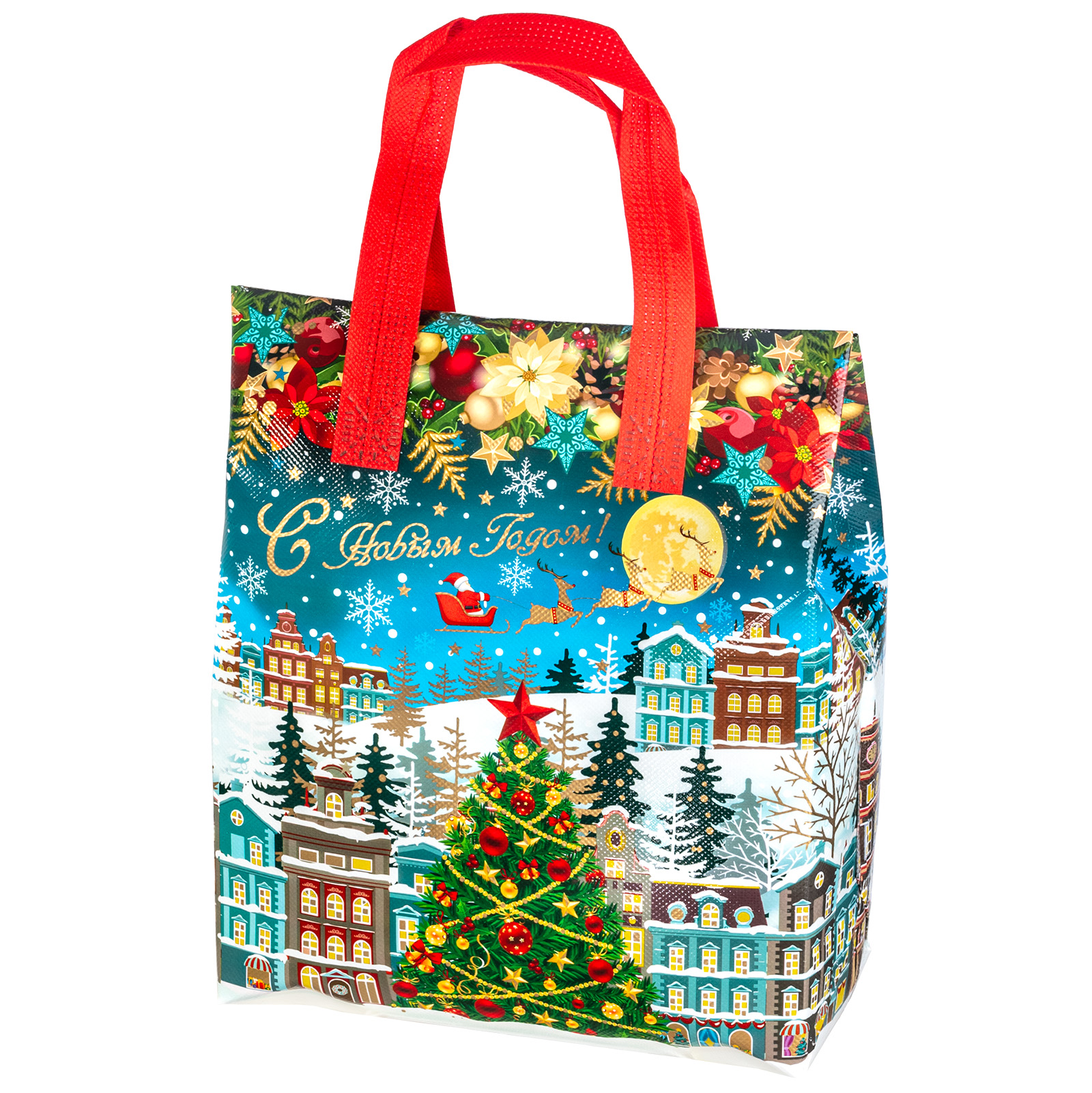 Интересный вариант новогоднего подарка – «Сумочка Чудо-городок». Отлично подойдет на подарок в 2026 году с символом Лошадь. Внутри такого презента находится кондитерский набор весом 1000 граммов.