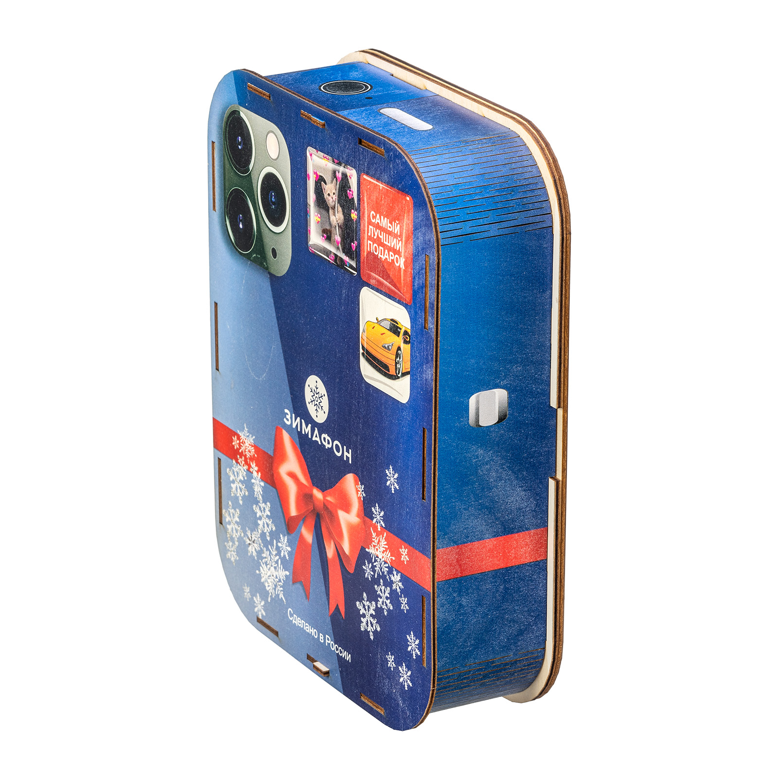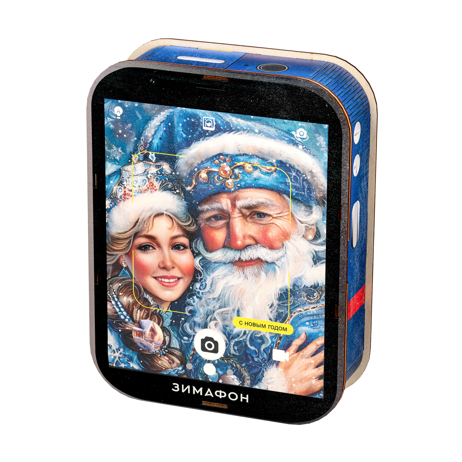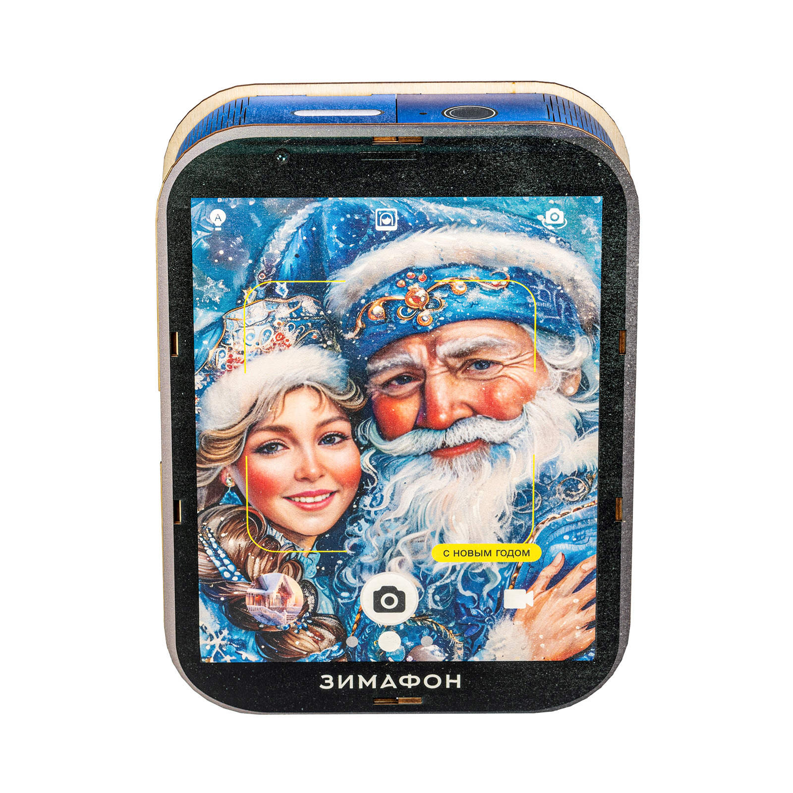 Современные дети настолько быстро развиваются, что порой их достаточно трудно удивить традиционными новогодними сладкими подарками. Именно для таких “продвинутых” сластен и был создан подарочный набор “Зимофон”. Это оригинальная деревянная коробочка, по форме оформлению максимально похожа на современный гаджет. На экране “Зимофона” мы видим Деда Мороза и Снегурочку, которые делают памятное фото с новогоднего праздника. Помимо хорошего разрешения камеры, данный смартфон обладает очень мощной памятью - в нем легко хранится целых 900 грамм вкусных и разнообразных сладостей, которых хватит на все новогодние праздники, а также небольшой памятный сувенир в виде символа наступающего года!
